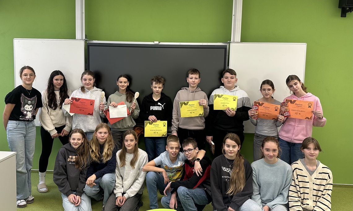 V průběhu měsíce listopadu měli žáci 7. tříd možnost zapojit se do soutěže, ve které si mohli ověřit nejen své znalosti angličtiny, ale také jak jim to jde s kamerou a jak zdatní jsou kuchaři. Jejich úkolem bylo samostatně, ve dvojicích či trojicích natočit video recept a doprovodit jej komentářem postupu v angličtině. Se zadáním si poradili na jedničku a zaslouží si velkou pochvalu za svou originalitu, vtip, zručnost i jazykovou úroveň. Ve vysoké konkurenci bylo těžké vybrat vítěze, nakonec však na 3. místě skončily Lada Kubáčková a Tereza Kolářová, na 2. místě se umístili Dominik Pecháček, Patrik Puda a Štěpán Mojžíš a 1. místo obsadily Eliška Koprnová a Eliška Juričková. Když jsme si jejich videa pouštěli ve třídě, všem se nám sbíhaly sliny Věříme, že je práce s kamerou bavila, a těšíme se, až budeme zase v angličtině probírat téma vhodné k natočení.