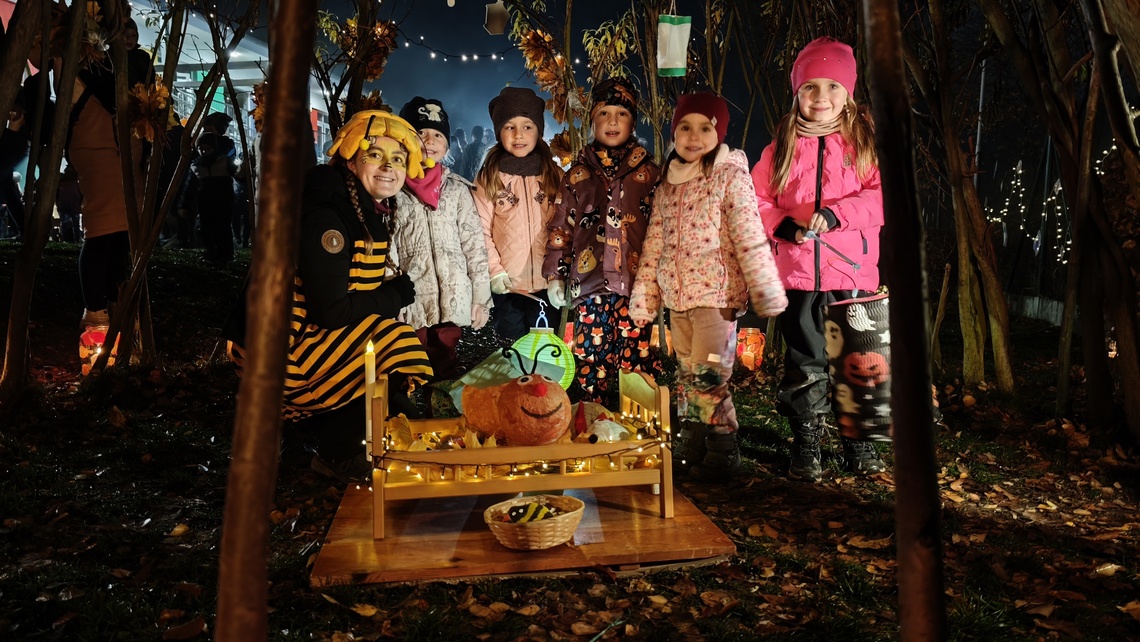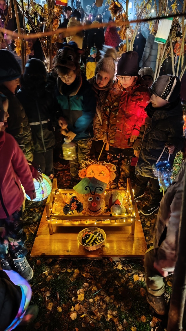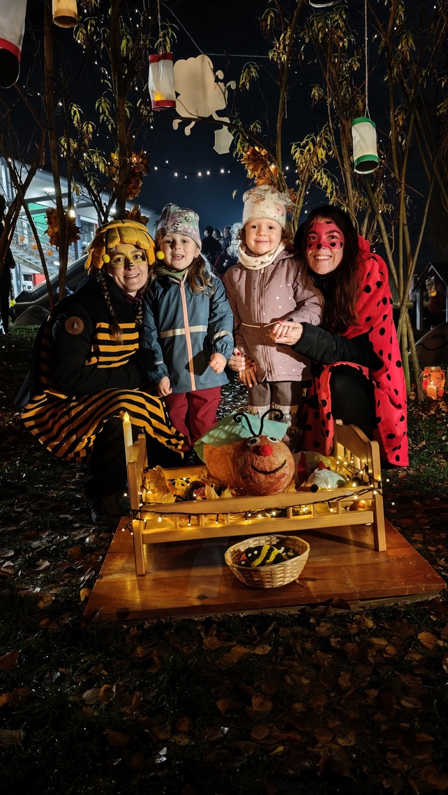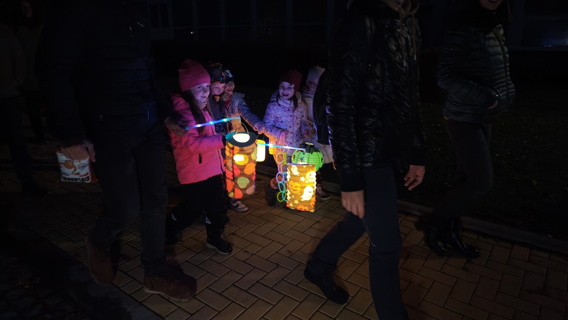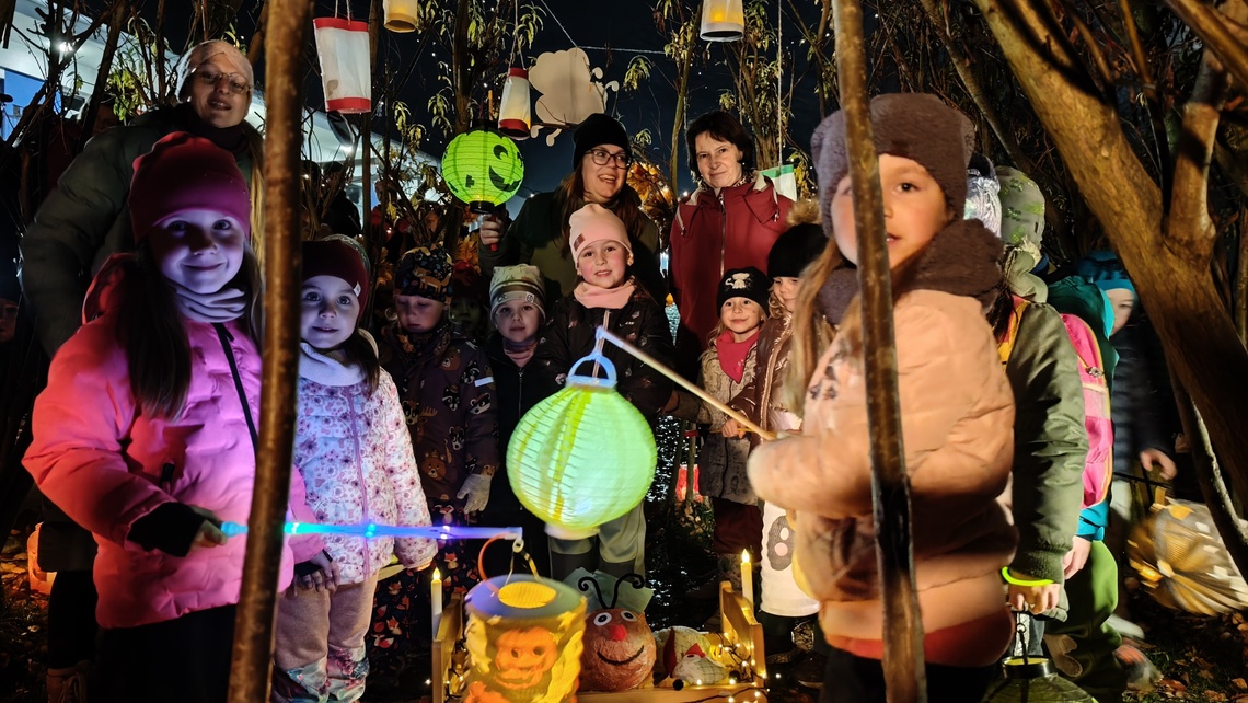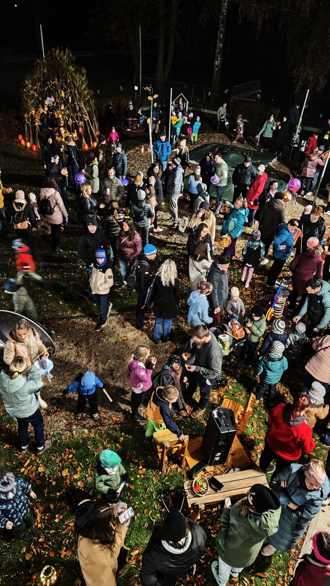 Po úvodním setkání na školní zahradě jsme se všichni vydali na lampionový průvod po okolí školy. Během cesty děti symbolicky potkávaly „unavené broučky“ připravující se k zimnímu spánku. Po návratu na zahradu na všechny čekalo veliké občertsvení.