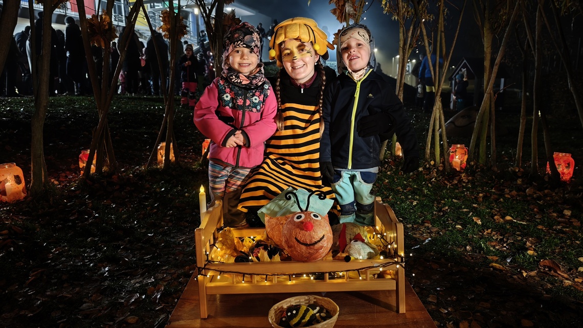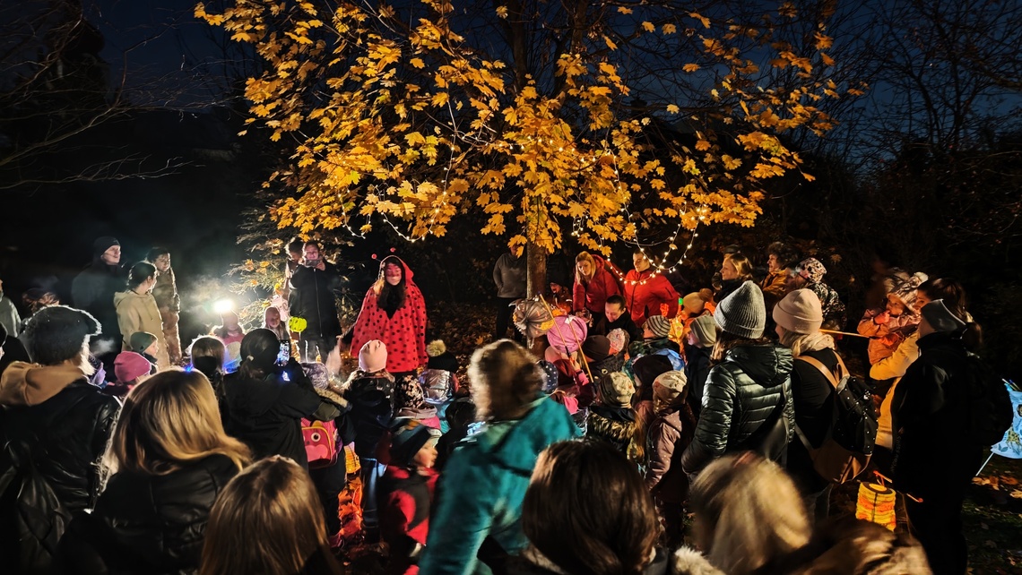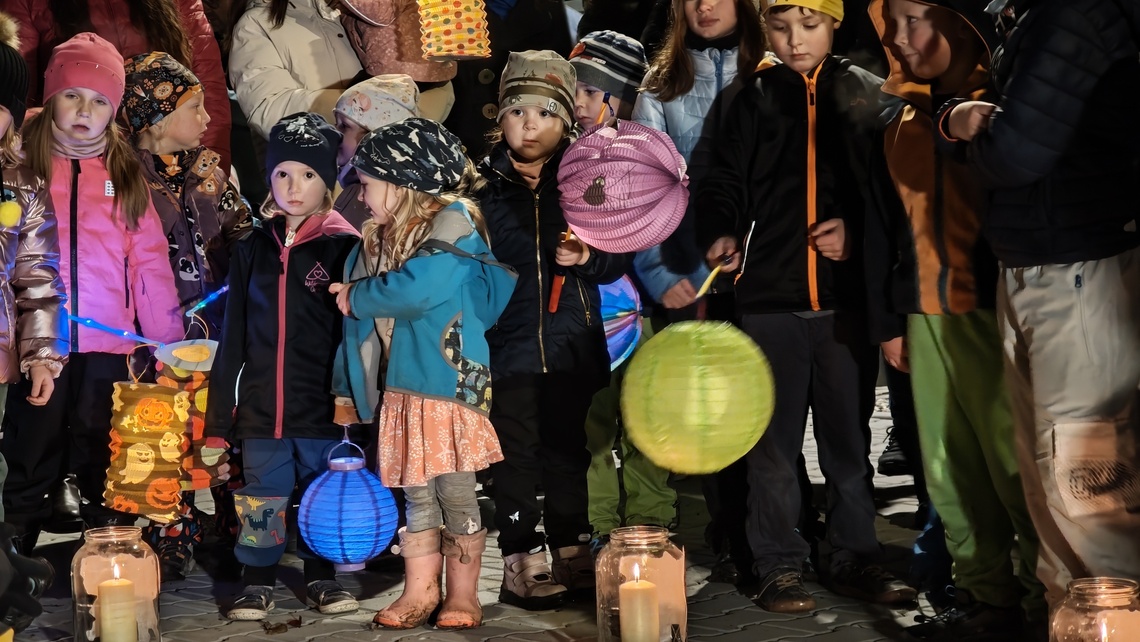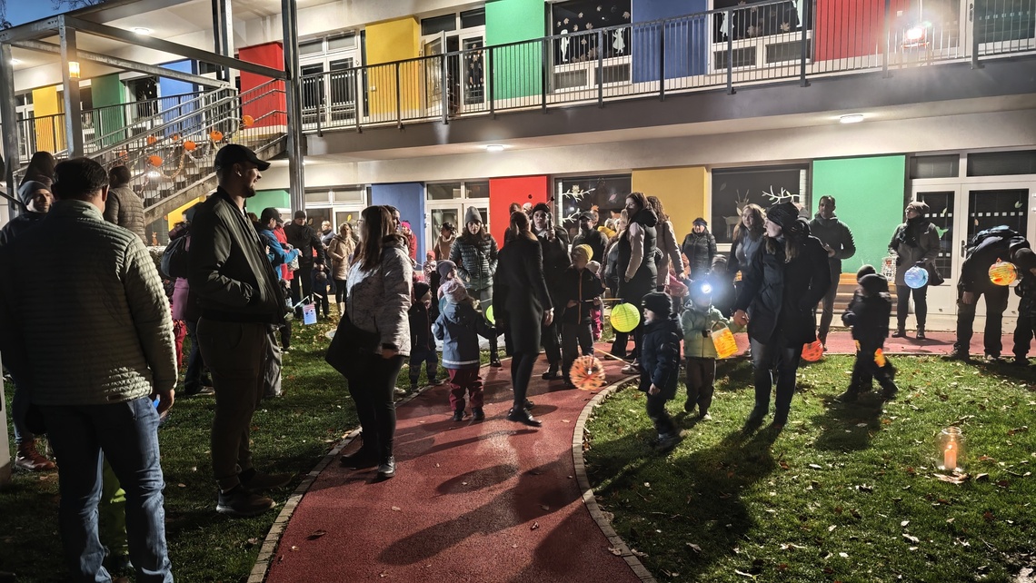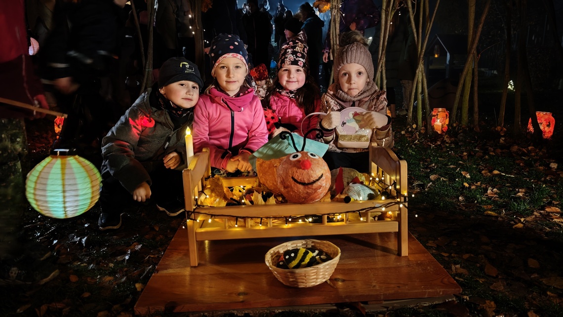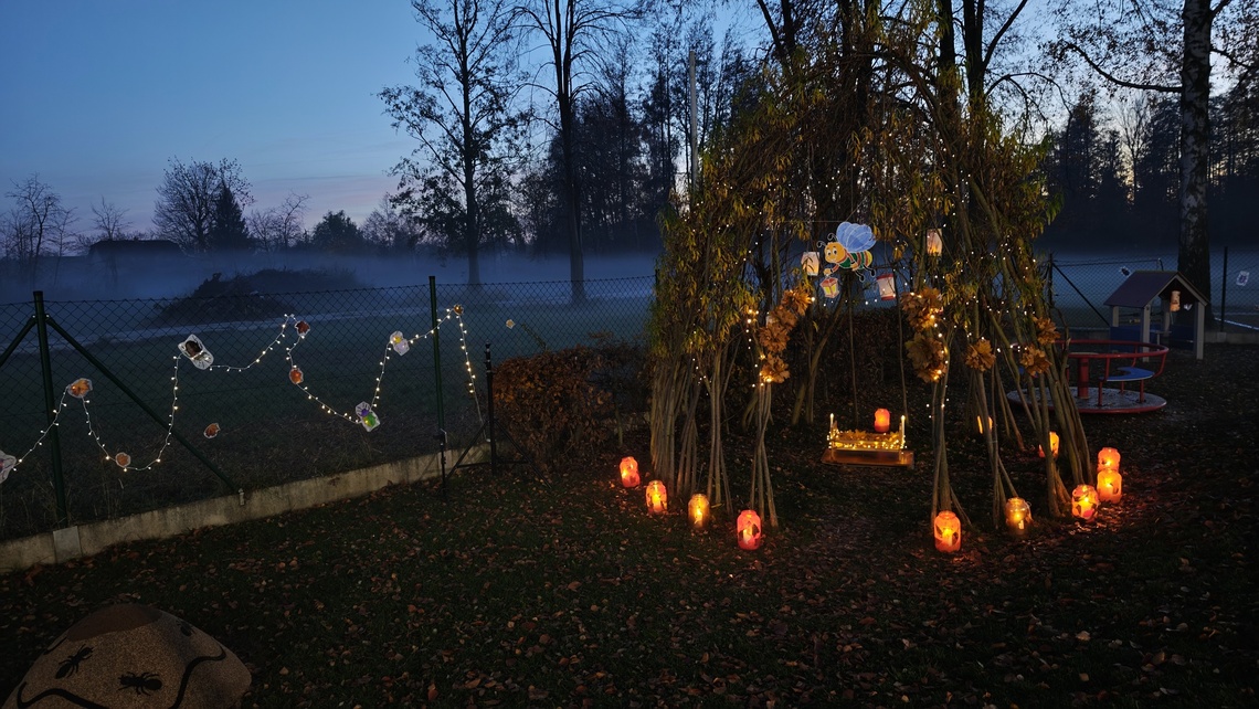 Po úvodním setkání na školní zahradě jsme se všichni vydali na lampionový průvod po okolí školy. Během cesty děti symbolicky potkávaly „unavené broučky“ připravující se k zimnímu spánku. Po návratu na zahradu na všechny čekalo veliké občertsvení.