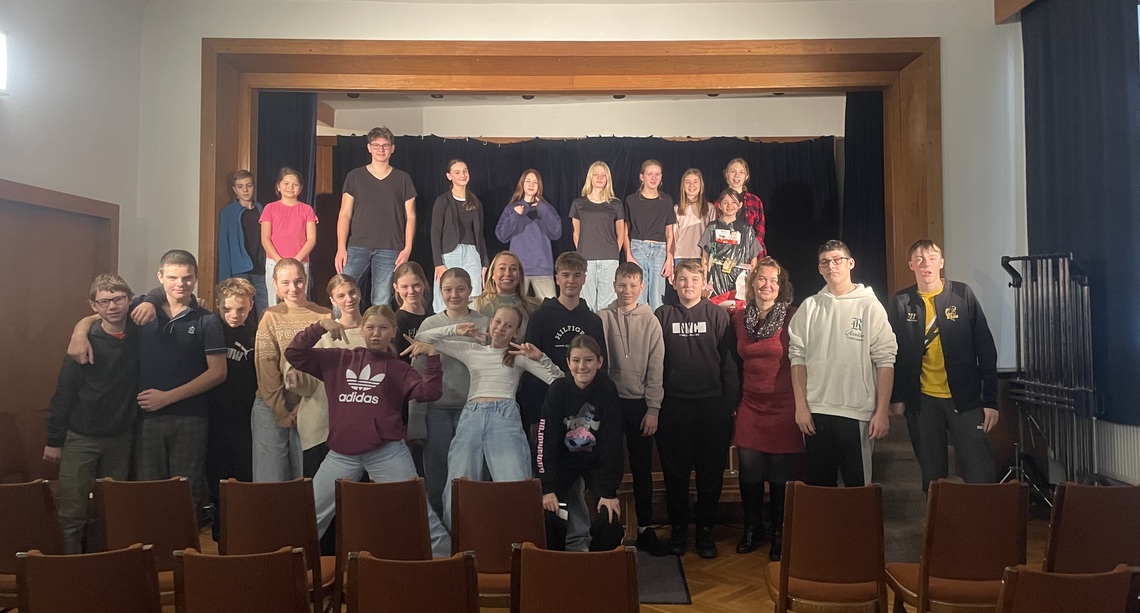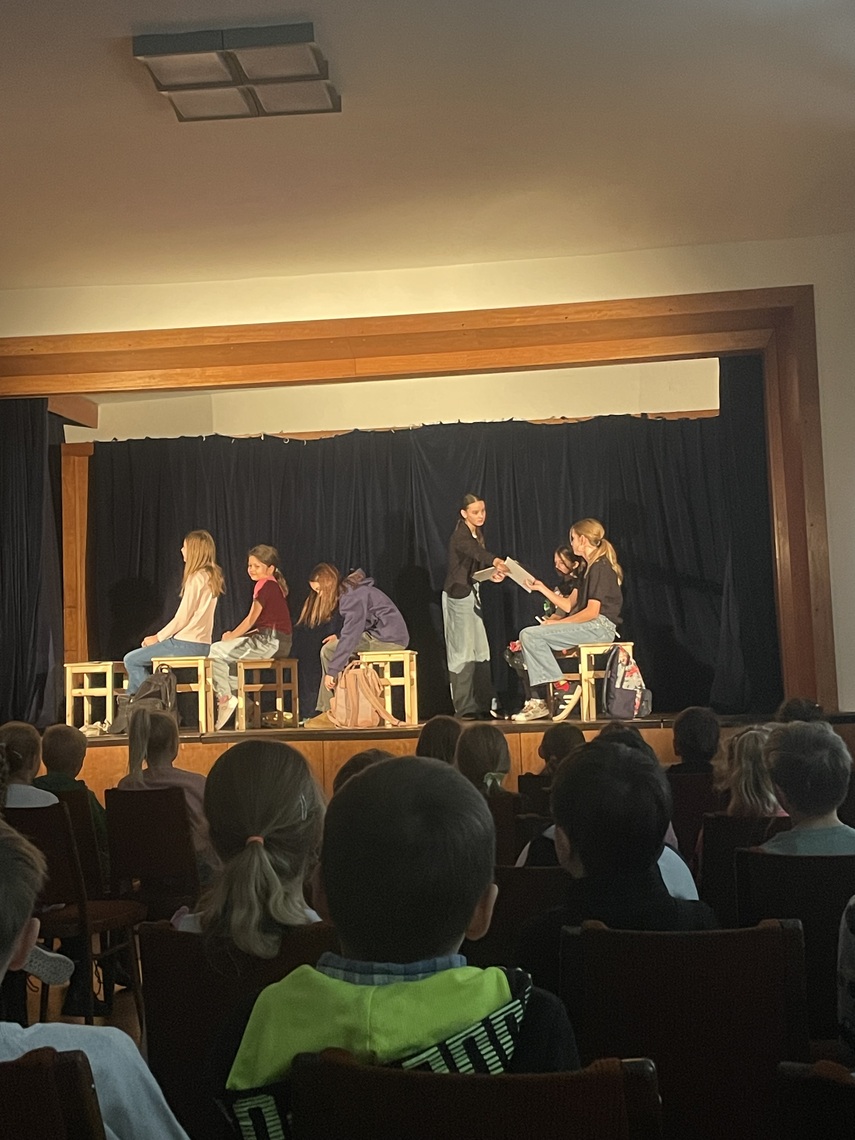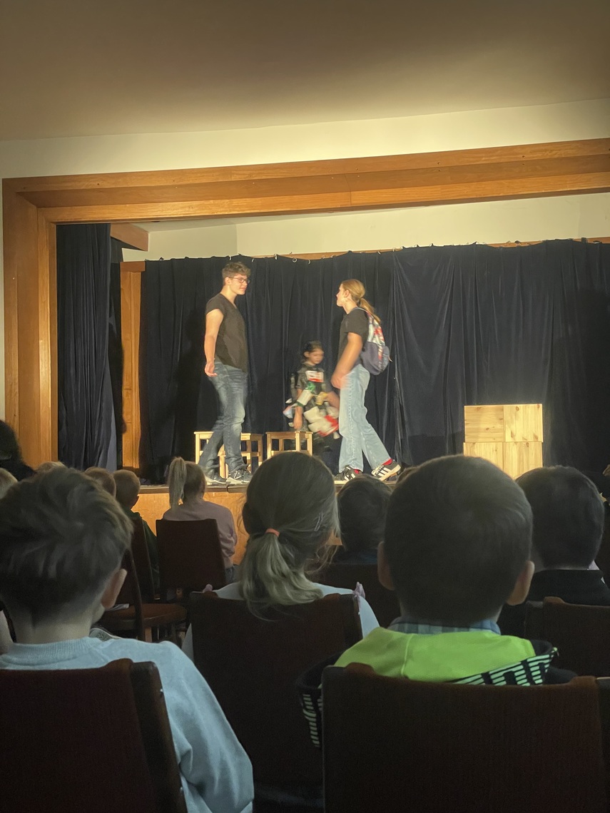 Žáci Eliška Juríčková a Honza Řapek ze 7. A navštěvují dramatický kroužek při ZUŠ Šternberk, kde se dlouhodobě věnují divadelní tvorbě. Celá naše třída se rozhodla přijet a podpořit je v jejich hereckém úsilí.