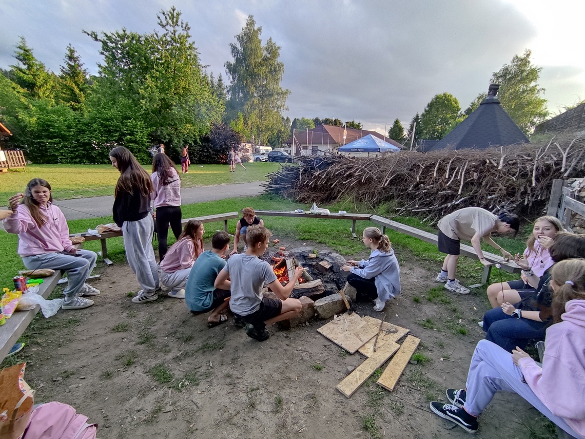 Po příjezdu a ubytování v chatkách jsme vyrazili na výšlap k Jurkovičově rozhledně, odkud se nám naskytl krásný výhled do okolí. Po návratu jsme si zahráli minigolf. Po večeři následovala krátká pauza na odpočinek, a ve 20:00 jsme zahájili společné opékání špekáčků a marshmallow. Celý večer se nesl v pohodovém duchu a díky tomu, že se žáci chovali opravdu vzorně, byla jim posunuta večerka.
